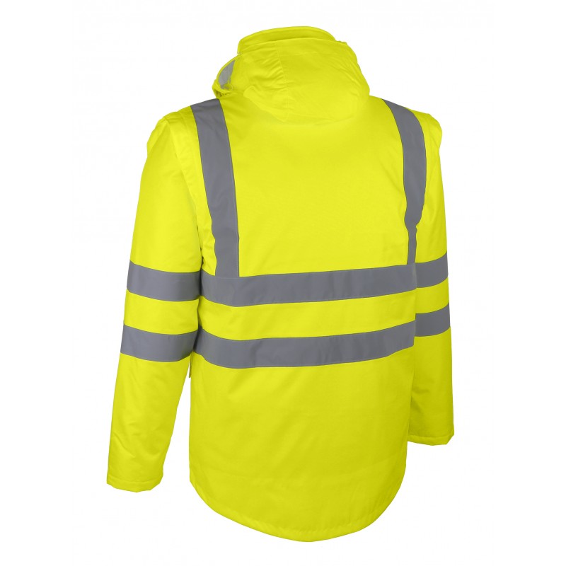 Doublure: polyester polaire, 280 g/m². Coutures étanchées. Capuche fixe avec cordon de serrage, enroulable dans le col. Manches amovibles. 3 poches extérieures et 1 poche intérieure. Fermeture à glissière sous rabat à boutons pression. Protège reins. Poignets bord-côte sous les manches. Bandes rétro-réfléchissantes. Ouverture à glissière pour sérigraphie.
