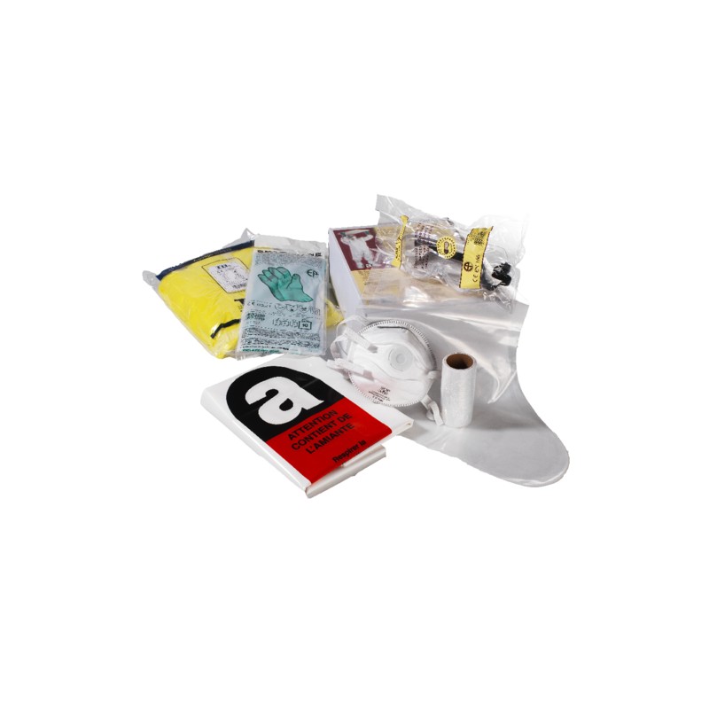 Composition du kit 1 combinaison SMS+CPE ref. 44444 1 lunette-masque MONOLUX ref. 60590 1 masque FFP NR D avec soupape ref. 23306 1 paire de gant nitrile ref. 5520 1 bobine de film étirable 2 sacs de récupération avec marquage "AMIANTE" 1 paire de surbottes jetables en polyéthylène transparent, taille unique. ref.45255